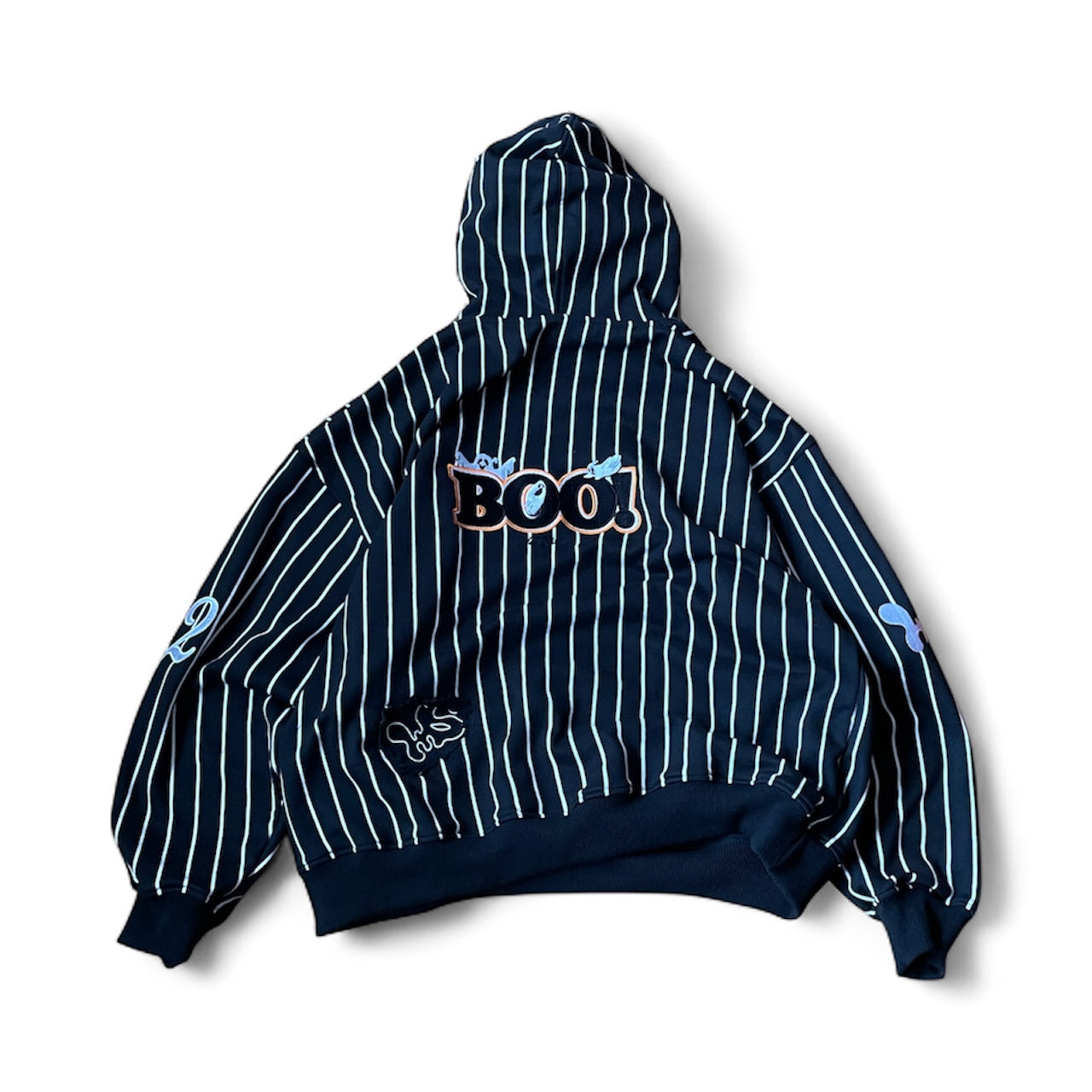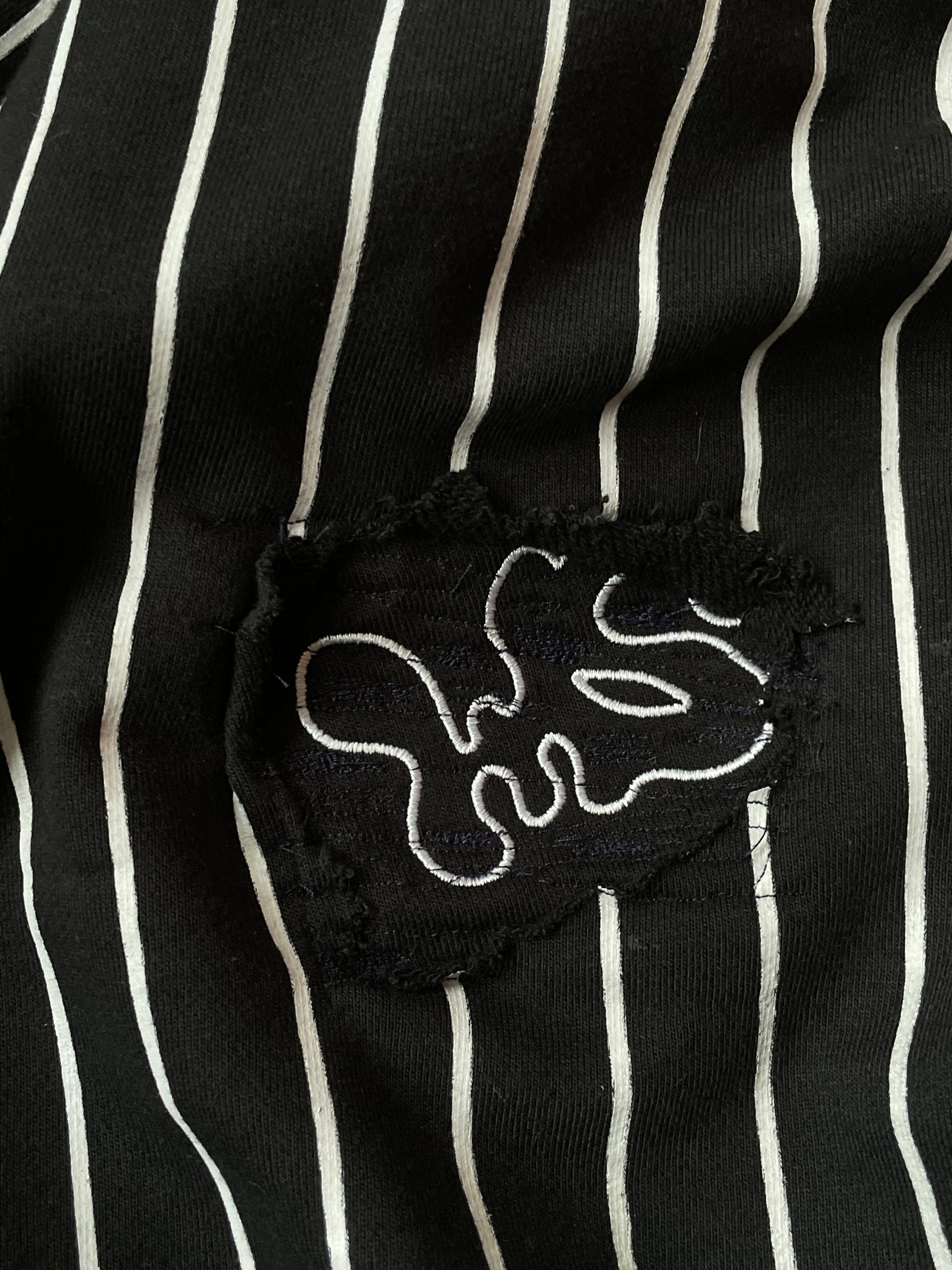 We released this hoodie a year ago for Halloween, and I had one leftover that I knew I wanted to do something fun with. It features two mended repairs throughout, using a traditional Japanese technique called boro stitching — a method originally used to patch and reinforce fabric, turning wear and tear into something intentional and beautiful.